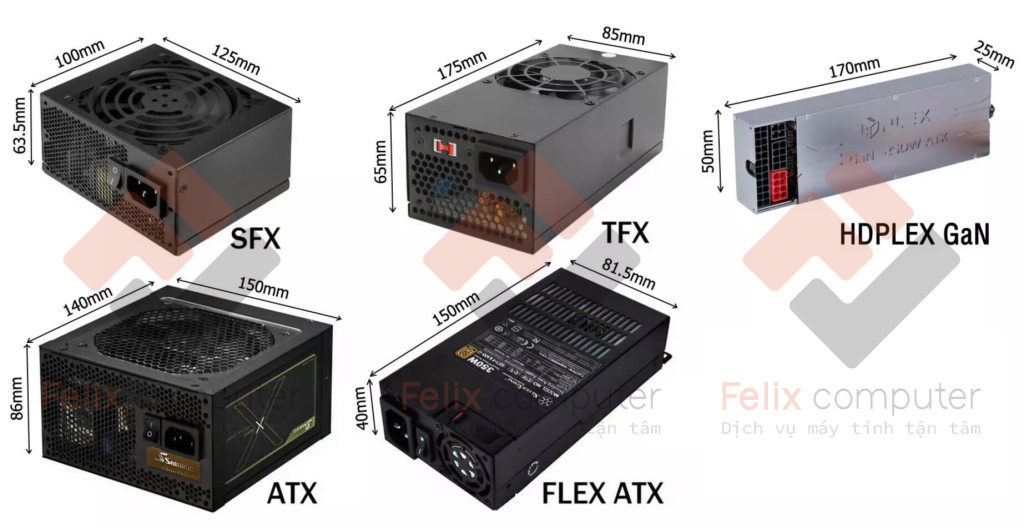 • Kích thước và chuẩn form factor: Bạn cũng cần đảm bảo PSU phù hợp với kích thước vỏ máy tính (case) của bạn. Các chuẩn phổ biến bao gồm ATX, SFX và SFX-L. Việc lựa chọn đúng kích thước giúp lắp đặt dễ dàng và đảm bảo luồng không khí lưu thông tốt, hỗ trợ tản nhiệt hiệu quả.
