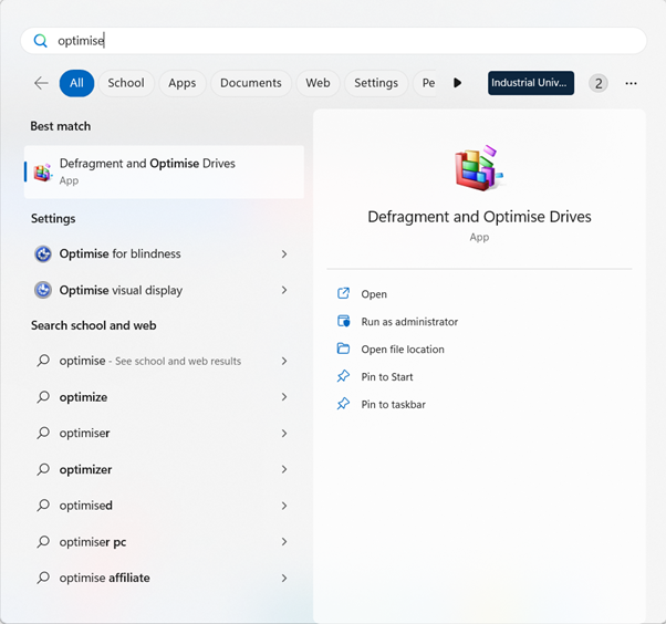 Bước 1: Nhấn phím Windows trên bàn phím (phím có biểu tượng hình cửa sổ) > Nhập vào khung tìm kiếm từ khóa Optimize, chọn Defragment and Optimize Drives.