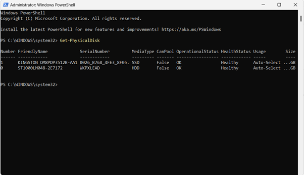 Bước 2: Trong cửa sổ PowerShell, hãy nhập vào đoạn lệnh Get-PhysicalDisk, sau đó nhấn Enter.