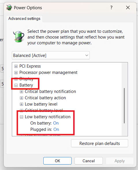 Để tắt thông báo pin yếu, bạn có thể thực hiện theo hai cách: thông qua Cài đặt Windows hoặc chỉnh trong Trình quản lý nguồn (Power Options).