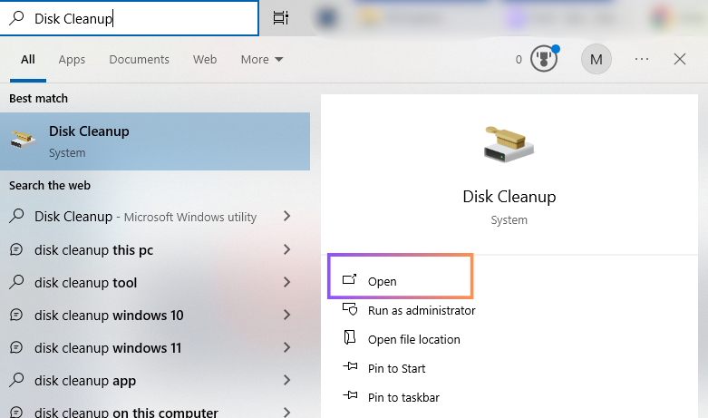 Bước 1: Nhấn Windows + S, gõ Disk Cleanup.