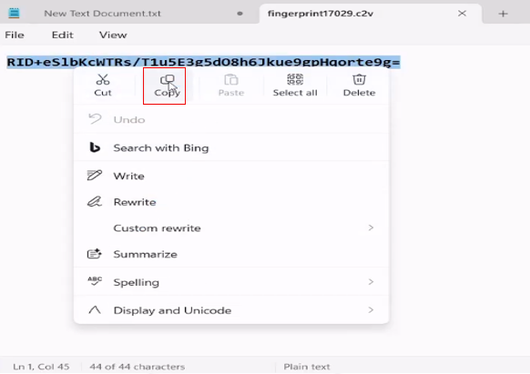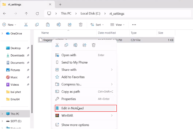 Sau đó, bạn quay lại thư mục rt_settings và mở file fingerprint17029.c2v bằng Open with notepad hoặc nhấn chọn Edit in Notepad, quét toàn bộ nội dung trong file và nhấn chuột phải chọn Copy