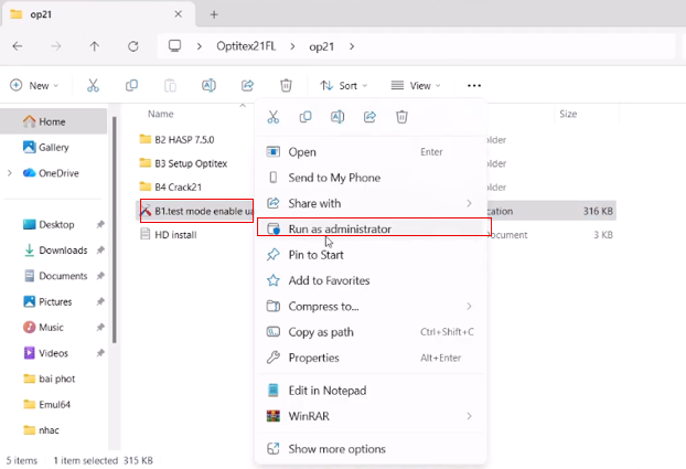 Mở folder Optitex21FL -> op21 -> chuột phải vào file B1.test mode enable uac disable và mở với quyền Admin