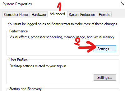 Bước 2: Chuyển sang tab Advanced, tại đây bạn hãy chọn Settings ở mục Performance.