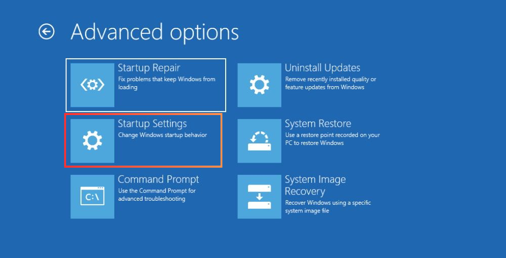 Bước 2: Khi vào màn hình Advanced options, tại Troubleshoot vào Advanced options và chọn Startup Settings.