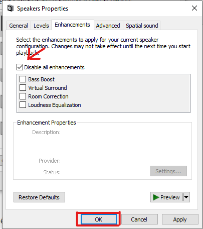 Chuyển sang tab Enhancements, tick vào ô Disable all sound effects. Cuối cùng, bấm OK để lưu lại thay đổi.